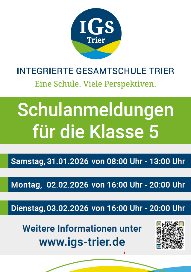 Die Schulanmeldung für die neuen Fünftklässler*innen findet an der IGS Trier immer direkt im Anschluss an die Vergabe der Halbjahreszeugnisse statt. An folgenden Terminen können Sie Ihr Kind an unserer Schule anmelden: