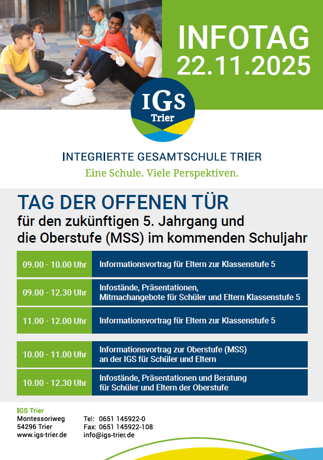 Um allen Interessierten – Kindern wie Eltern - eine Entscheidungshilfe zu geben und um für uns zu werben, lädt die Integrierte Gesamtschule Trier am 22.11.2025 zu einem Infotag ein.